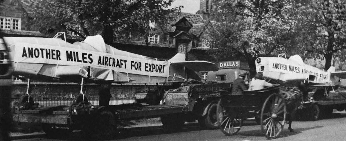 Publicising their contribution to the export drive, Miles trailered these Magisters destined for the Portuguese Army Air Force through the streets suitably bedecked in May 1946. It is noticeable that the aircraft were not sealed or fully protected for the journey.