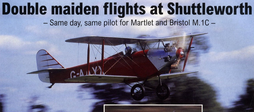 Регистрационный номер: C4918, G-BWJM A DOUBLE FIRST occurred at Old Warden on September 25, 2000, when Shuttleworth Collection Southern Martlet G-AAYX flew for the first time after a long restoration, and Bristol M.1C reproduction G-BWJM/“C4918", built by Northern Aeroplane Workshops, made its first ever flight.