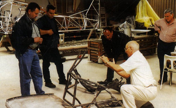 Fw 189 owner Jim Pearce (in white shirt) shows part of the aircraft’s nose glazing to Flug Werk’s Hans-Gunther Wildmoser (left), Hubert Hartmeir (2nd left) and Claus Colling (stooping beside Jim) in Sussex earlier this year.