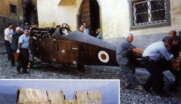 The Balilla fuselage leaving Bergamo Castle for Turin.