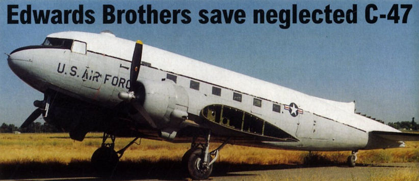 CLIVE AND MARK EDWARDS of Edwards Brothers Aviation at Welling, Kent, well known for the healing powers they can bring to distressed propliners, have recently rescued a Douglas C-47 from dereliction near Beale Air Force Base (AFB), California, in the USA and flown it to the Yankee Air Museum (YAM) at Chino, California.