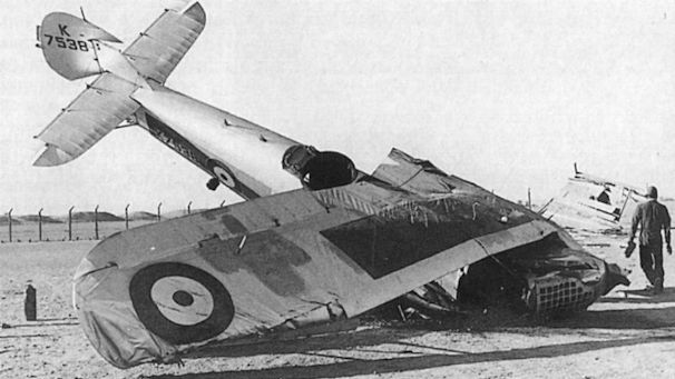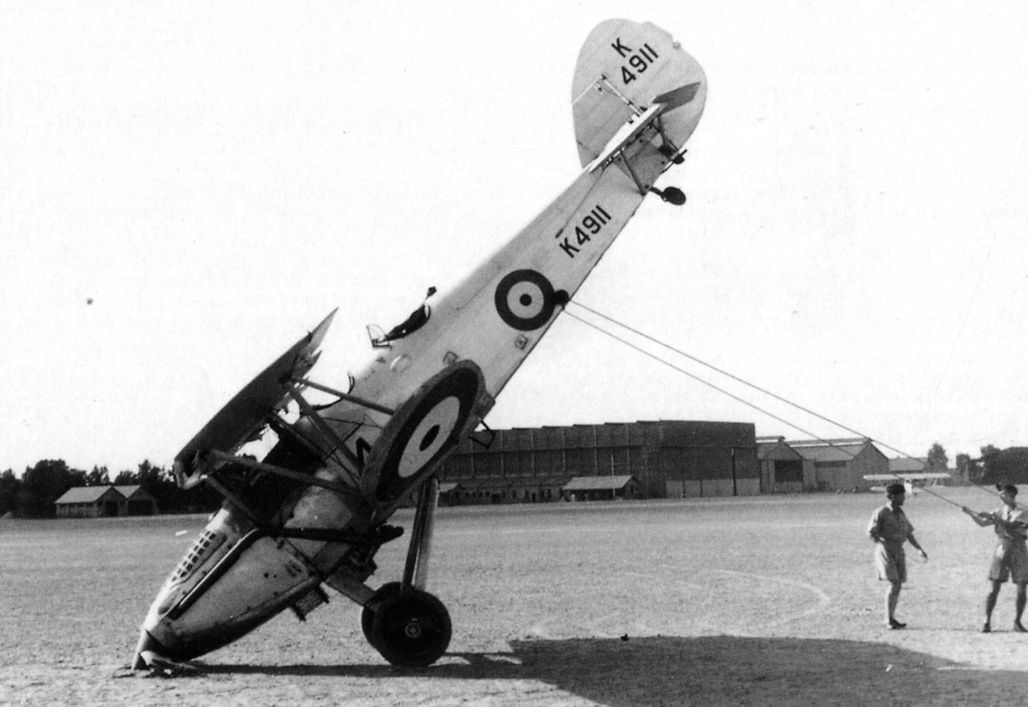 Регистрационный номер: K4911 Hawker Hart Trainer K4911 swung on landing and tipped up on its nose at Abu Sueir on October 24, 1938; here an attempt is made to tip it back. Repaired on site, it was finally struck off charge on February 15, 1942.