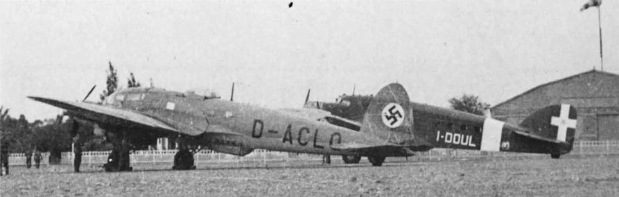 Регистрационный номер: D-ACLQ, I-DOUL The photo from Godfrey Ball via Dave Birch, shows Heinkel He 111 D-ACLQ and Savoia Marchetti SM.79 I-DOUL at Maison Blanche, Algeria in November 1942. During Operation Torch the Hurricanes of 43 Squadron flew in and took the airfield without opposition, finding these two aircraft which apparently belonged to the German Armistice Commission. Dave thinks that they might have been used for liaison with Vichy France but would like to know what happened to them after they fell into Allied hands. Were they captured, destroyed, or considered neutral and allowed to fly away? Can anybody help please?
