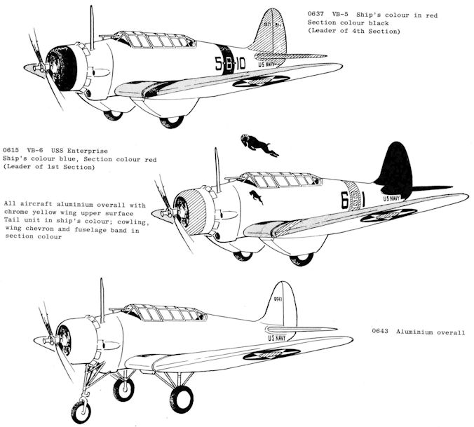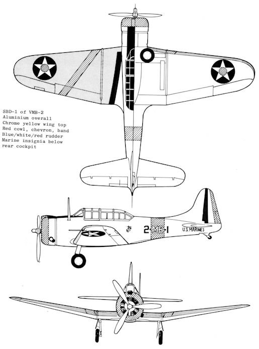 SBD-1 of VMB-2. Aluminium overall, Chrome yellow wing top, Red cowl, chevron, band, Blue/white/red rudder, Marine insignia below rear cockpit