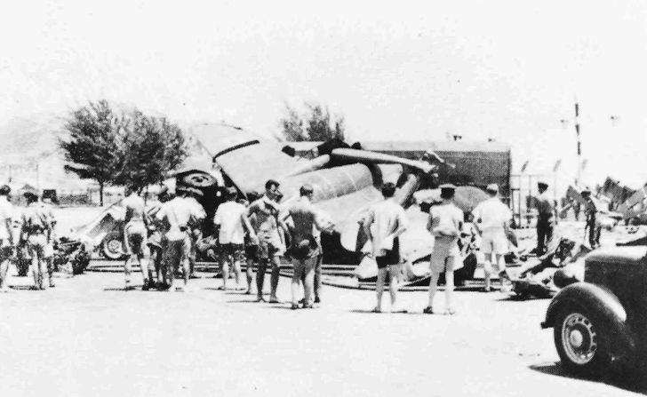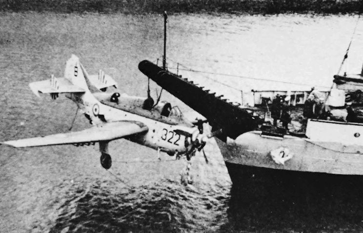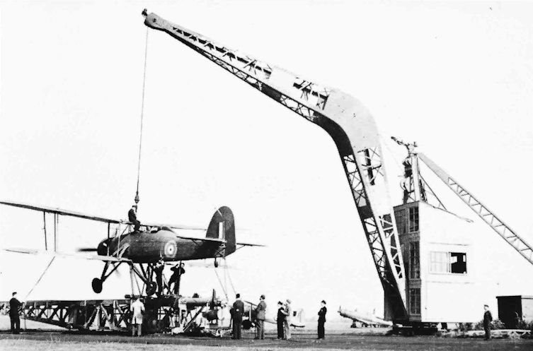 Crane-fanciers may recognise the structure from which K5926 is dangling and so identify where the photograph was taken. In the background are Skuas and a Lysander. Note that the engine is already running while a tight rein is being kept on the wings. In place of the gunring, a headrest is fitted. Personnel would appear to be all RAF.Самолёты на фотографии: Blackburn Skua / B-24 - Великобритания - 1937Fairey Swordfish - Великобритания - 1934Westland Lysander - Великобритания - 1936