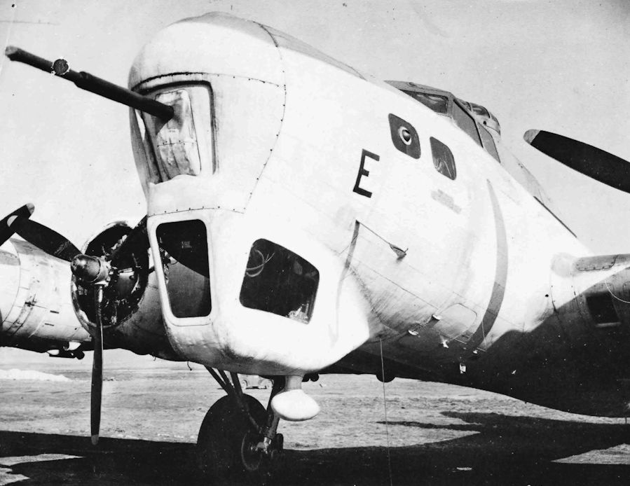 Регистрационный номер: FK185 A close-up of a very large cannon fitted in the nose of a Fortress IIA. It appears to be a 40mm weapon to be used against U-boats. A cabin for the gunner has been built in under the nose.
