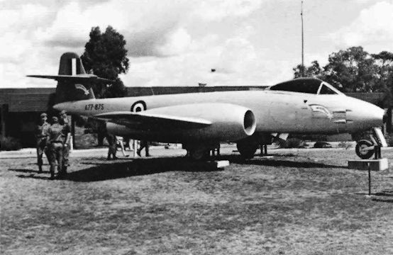 Регистрационный номер: A77-875 From Norman Wiltshire comes this photograph of Meteor F.8 A77-875 on exhibition at Williamtown at the present moment. This seems to be the unidentified one in the photograph on page 64.