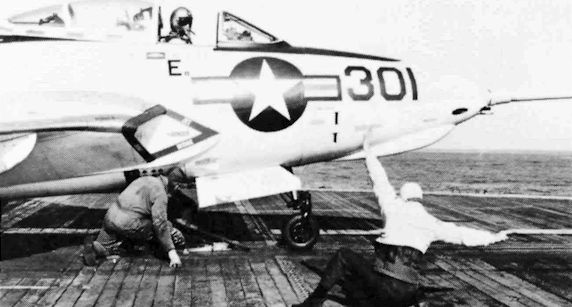 F9F-8 Cougar being secured for catapulting