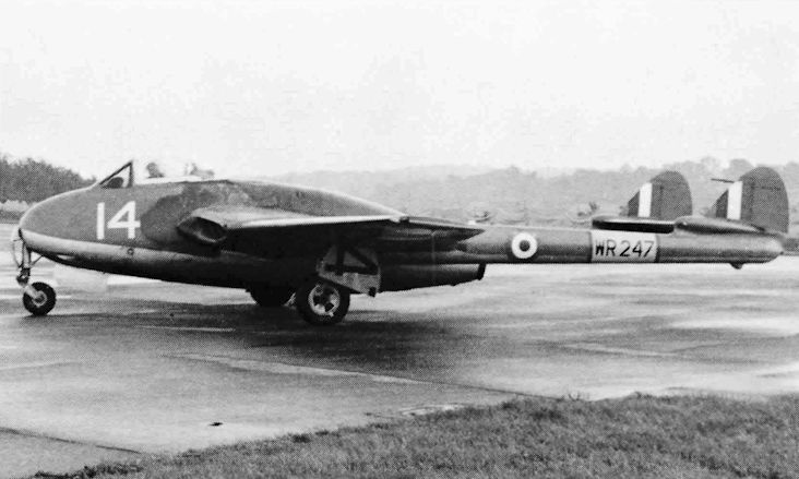 Регистрационный номер: WR247 This Vampire FB.9 was a trainer with the RAF College at Cranwell. Note College light blue band over serial.