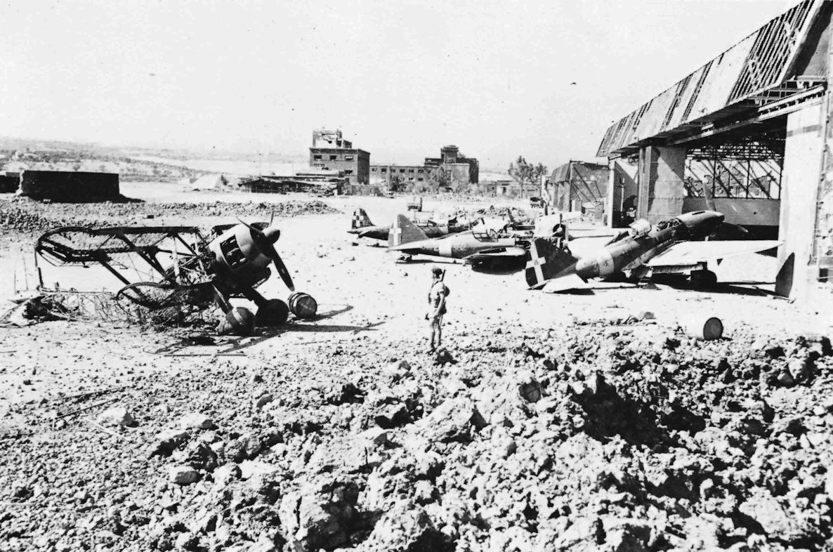 Catania airfield after the RAF had paid a few visits. Visible are the remains of a CR.42, C.200, G.50 and Re.2005