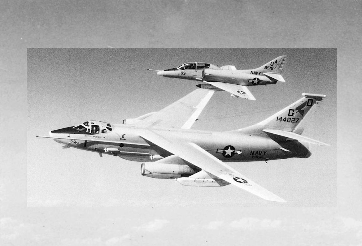 Douglas TA-4J из эскадрильи VC-1 в одном строю с ERA-3B (№ 144827) из VAQ-33 во время учений в 1978 году. Обратите внимание на два ветроэлектрогенератора на борту Skywarrior и контейнеры AN/ALQ-76 под его крылом. Дополнительная аппаратура РЭБ была установлена в бомбоотсеке самолета.