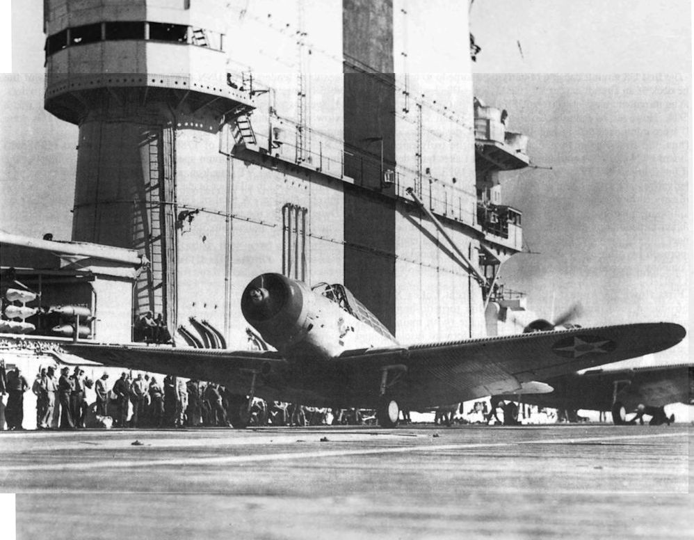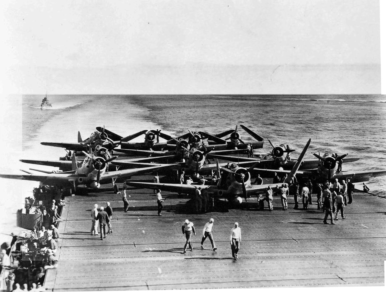 Torpedo-armed TBD-1s of VT-6 being spotted on the flight deck of Enterprise just before the Battle of Midway on 4 June 1942.Самолёты на фотографии: Douglas TBD-1 Devastator - США - 1935