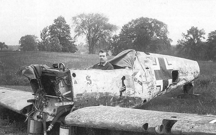 William Wheeler sits in the remains of Messerschmitt Bf 109 "White 4" in Canada in 1964. The aircraft was subsequently returned to England where it was restored after more than 25 years in storage; it is now on permanent display in the Imperial War Museum at Duxford.