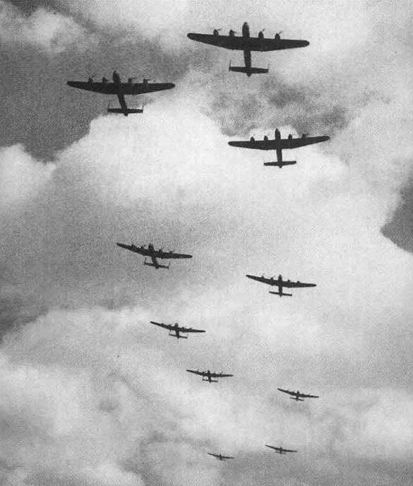 A Lancaster III prepares to take off on a night bombing raid. Although the idea of a special pathfinding force was first used by the Luftwaffe in raids over Britain in 1940, it was the RAF which exploited the idea to its full potential, using improved navigational techniques to mark targets accurately for Main Force squadrons.