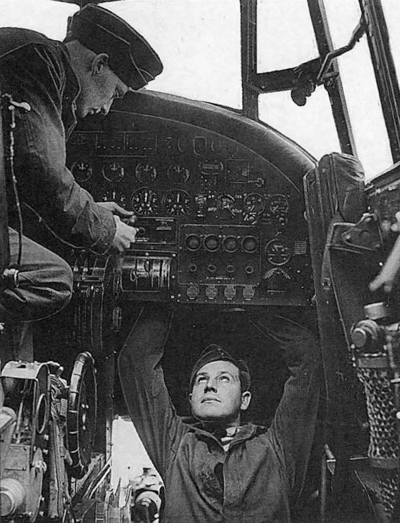 Instrumentation was installed in the Lancaster's cockpit before the forward fuselage section was mated to the rest of the airframe. Here, RAF servicing and repair mechanics work on a squadron aircraft.