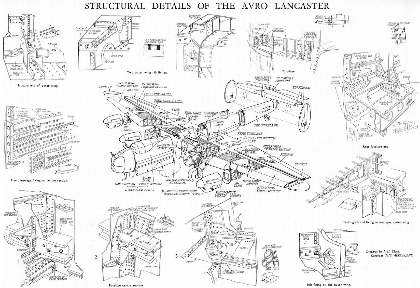 J.H. Clark's drawings of the Lancaster's structure and sub-assembly breakdown, from The Aeroplane of August 14, 1942.