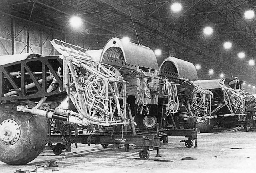 Lancaster wing/fuselage centre sections, complete with undercarriage and inner engine mounts, await mating with outer sections.
