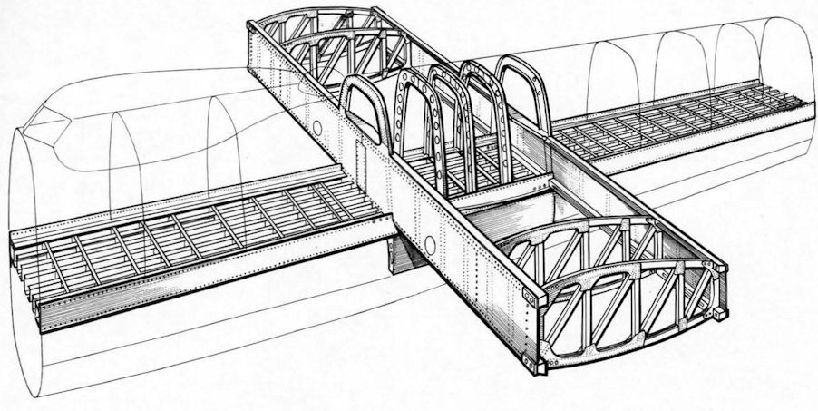 The heart of the Lancaster: the reinforced fuselage floor/bomb beam and the massive wing centre section. This illustration was first published not in The Aeroplane but in Flight of August 13, 1942.
