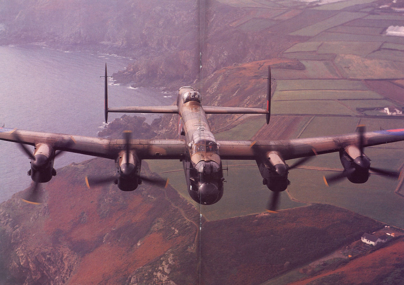 Регистрационный номер: PA474 [6] Avro Lancaster Mk I PA474 of the RAF’s Battle of Britain Memorial Flight was photographed by MIKE VINES/PHOTO LINK over the Channel Islands in September 1992, being flown by Sqn Ldr Andy Tomalin. This picture was shot from the back of the RAF Falcons parachute team’s Andover - which may be seen reflected in the Lancaster’s nose glazing and spinners