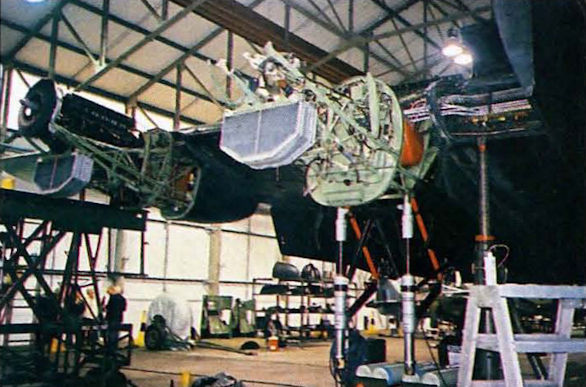 Регистрационный номер: PA474 [6] With the cowlings and No 3 engine removed ready for a replacement, the underslung radiators and complex pipework are revealed. Note that the starboard mainwheel has also been removed for maintenance.