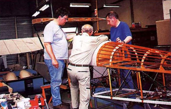 C&C members view the Memorial Flight Association (MFA) S.E.5a project at La Ferte-Alais, guided by the MFA's UK representative (and Aeroplane author) Melvyn Hiscock (left).