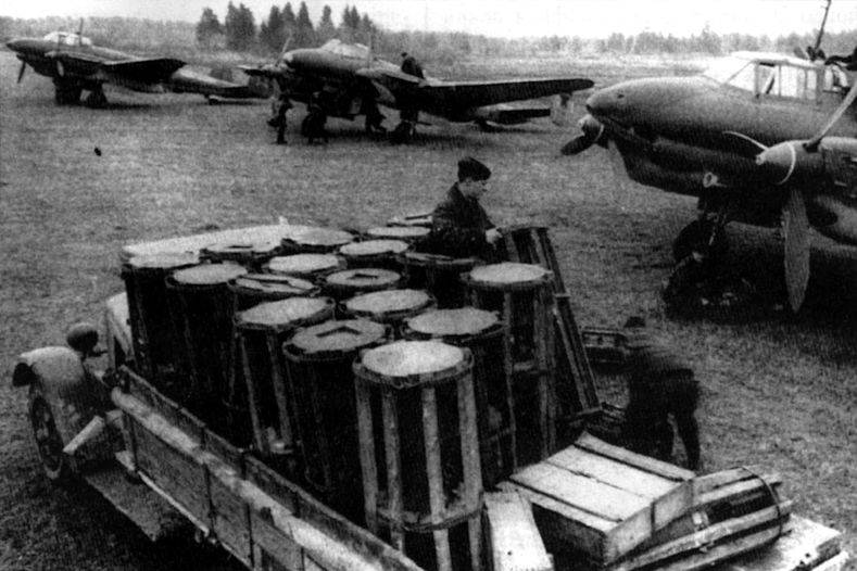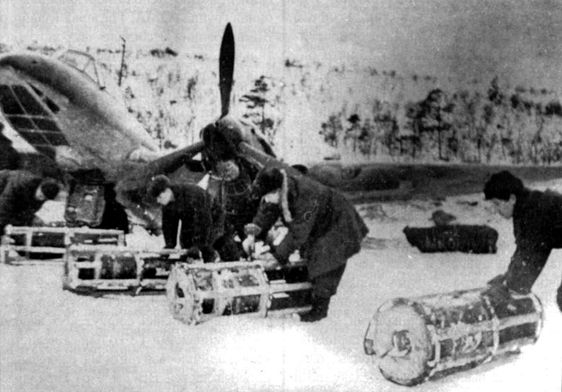 Бомбы в упаковке подкатывают к Пе-2, Северный флот, зима 1941-42 годов.