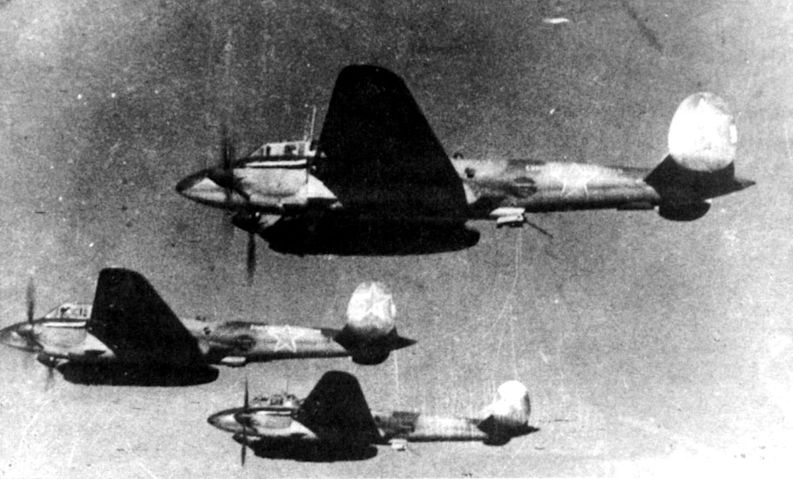 A formation of Pe-2FTs flying with aft-firing ventral gun deployed. This gun was fired by the radio operator and aimed by means of a periscopic sight.Самолёты на фотографии: Петляков Пе-2 - Россия - 1940