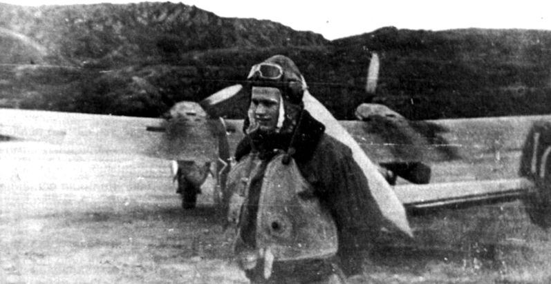 Летчик М. Белоногов перед Пе-3 из состава 95-го иап ВВС Северного флота