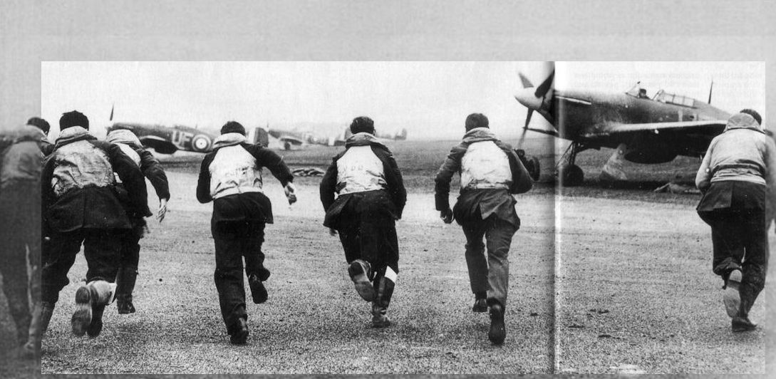 Scramble! Pilots of 601 (County of London) Sqn race to their waiting Hurricanes. No 601 ranks tenth in John Alcorn’s survey of top-scoring units.Самолёты на фотографии: Hawker Hurricane - Великобритания - 1935