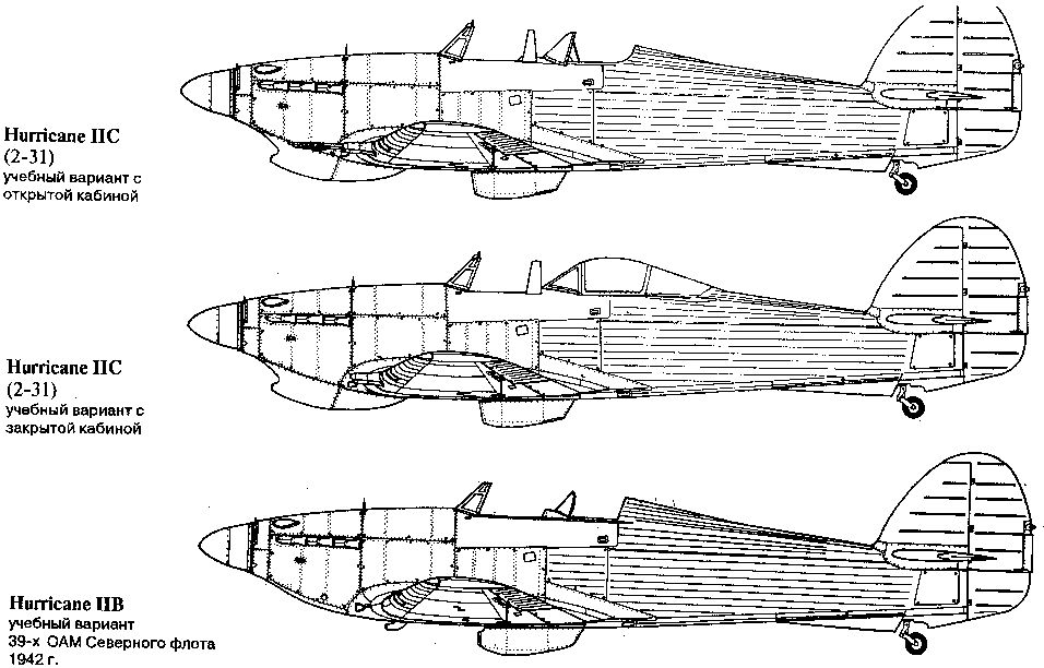 Hurricanes were first seen in Russia in September 1941 when Nos 81 and 134 Squadrons, RAF, arrived at Vaenga, to help protect the ports of Archangel’sk and Murmansk and to instruct Soviet personnel in operation of the Hurricanes that were being supplied to Russia in large numbers. A Mk IIB with locally-fitted armament of two 20-mm cannon and two 7,7-mm machine gunsСамолёты на фотографии: Hawker Hurricane - Великобритания - 1935