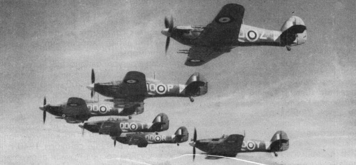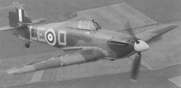 После списания из боевых частей Hurricane Mk I часто передавались в летные школы. Например, эта машина была разоружена и отправлена в Центральную британскую летную школу в Халлавингтоне. На фотографии она летит рядом с двумя Spitfire Mk IIA.
