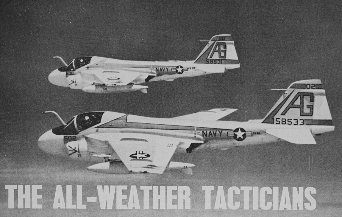 The tone drawing depicts an A-6E of Navy Squadron VA-65, carrying five drop tanks.