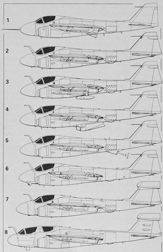Comparative side views show (1), the A2F-1 development aircraft with hinged jet tailpipes, narrow rudder, test nose probe and hinge fairings on upper tailplane surface; (2) early production A-6A with fixed jetpipes, perforated air brakes, broad rudder, in-flight refuelling probe, and aft-positioned tailplane; (3), A-6B with Standard ARM missiles; (4), A-6C with FLIR and LLLTV in ventral fairing; (5), KA-6D tanker; (6), new-production A-6E, without fuselage air brakes and with TRAM sensors under nose; (7), EA-6A and (8), EA-6B Prowler.