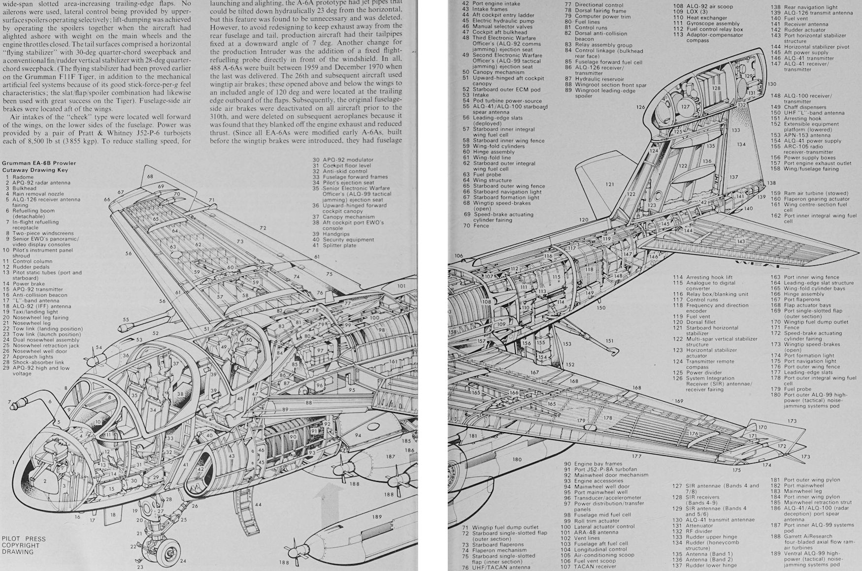 This illustration of an EA-6A undergoing deck-handling trials prior to delivery to the Marine Corps shows the ECM radomes on each wing and the top of the fin; note also the special equipment pods inboard, the wing fold and the retractable access steps to the cockpit.