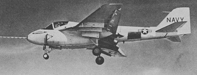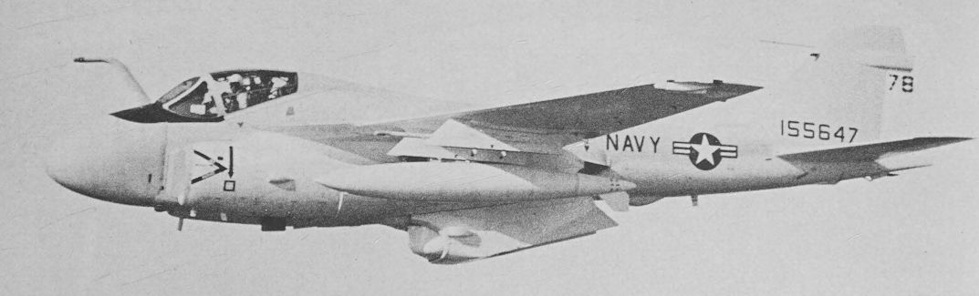 A Grumman A-6A engaged in weapons trials, carrying a Rockwell AGM-53A Condor air-to-surface missile on the port wing pylon. The Condor is in process of being added to the inventory of weapons carried by the Intruder.