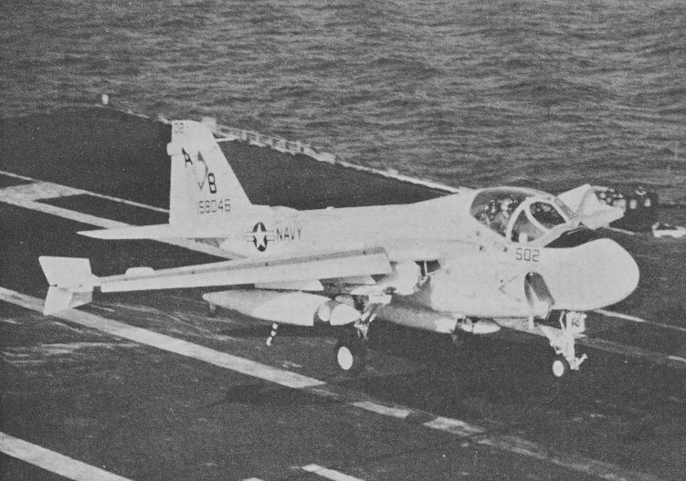With wing slats extended and air brakes open, an A-6E Intruder from VA-34 comes aboard the USS John F Kennedy. The large nose radome covers a Norden AN/APQ-48 all-weather radar system which simultaneously provides a mapping display for detection, identification and acquisition of the target; terrain-avoidance information and aircraft-to-target position for precision bombing.
