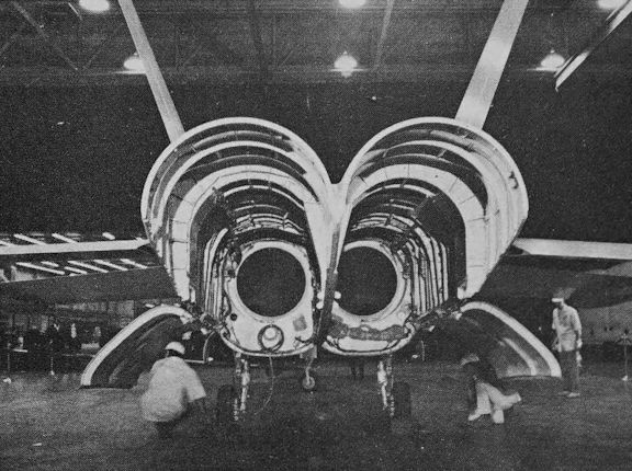 An illustration showing that the YF-17’s tailplanes need no support when the engines are removed. Notice also that the engine bays are completely plumbed to receive the engine and are remarkably clean (by design) to facilitate quick engine changes and to reduce the probability of plumbing damage, etc.