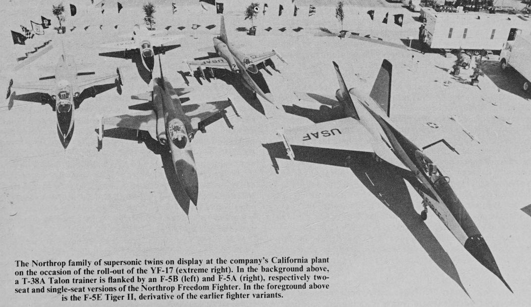 The Northrop family of supersonic twins on display at the company’s California plant on the occasion of the roll-out of the YF-17 (extreme right). In the background, a T-38A Talon trainer is flanked by an F-5B (left) and F-5A (right), respectively two-seat and single-seat versions of the Northrop Freedom Fighter. In the foreground is the F-5E Tiger II, derivative of the earlier fighter variants.