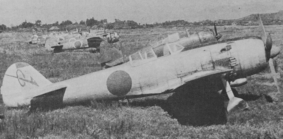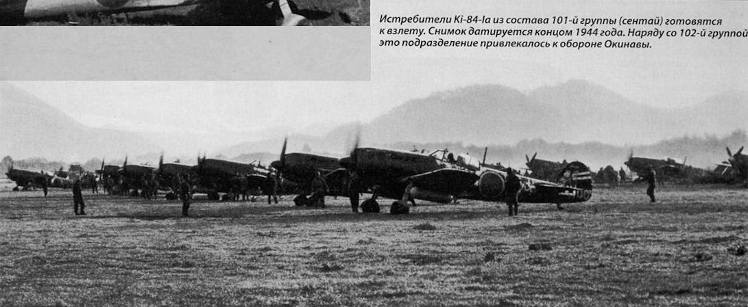 Истребители Ki-84-Ia из состава 101-й группы (сентай) готовятся к взлету. Снимок датируется концом 1944 года. Наряду со 102-й группой это подразделение привлекалось к обороне Окинавы.