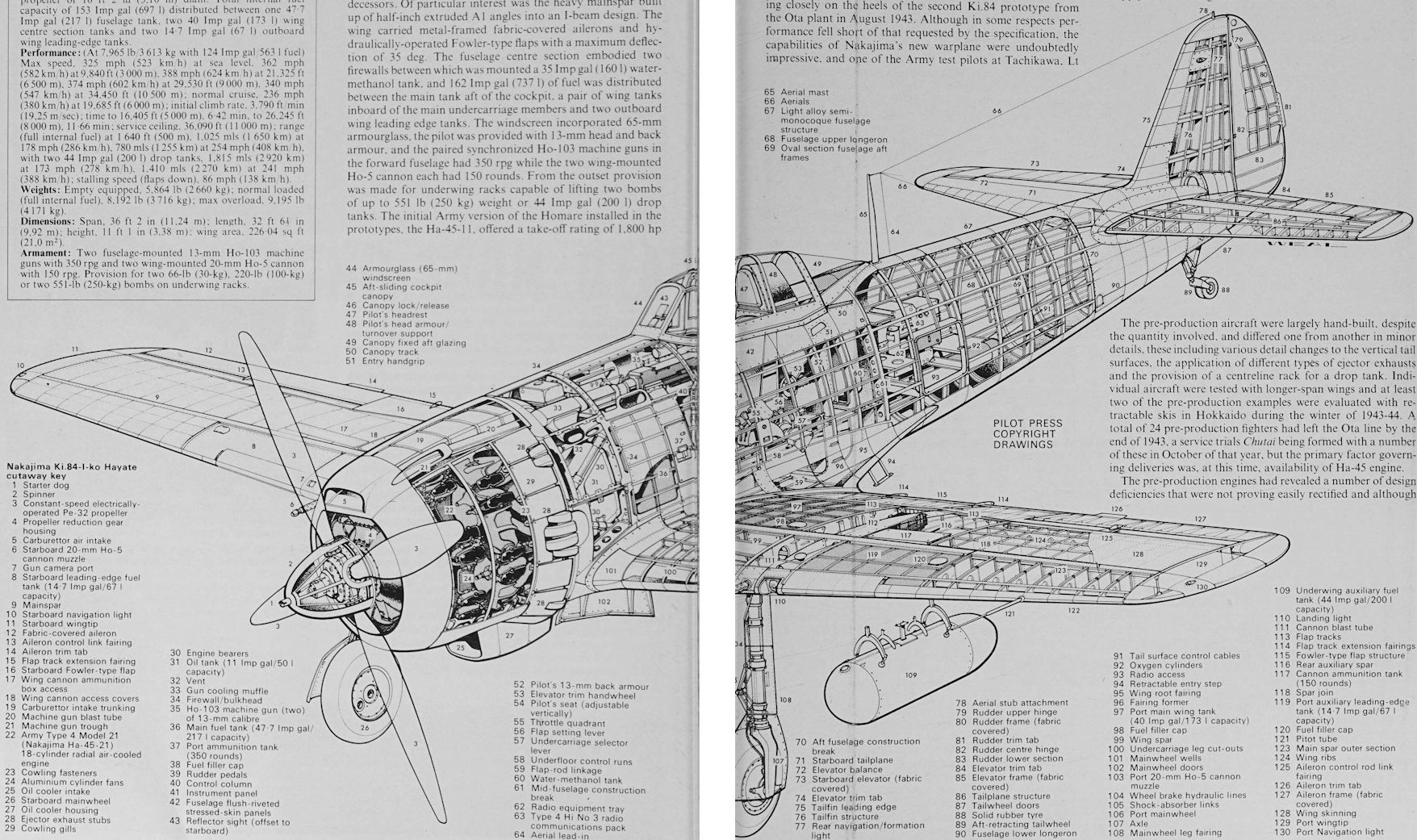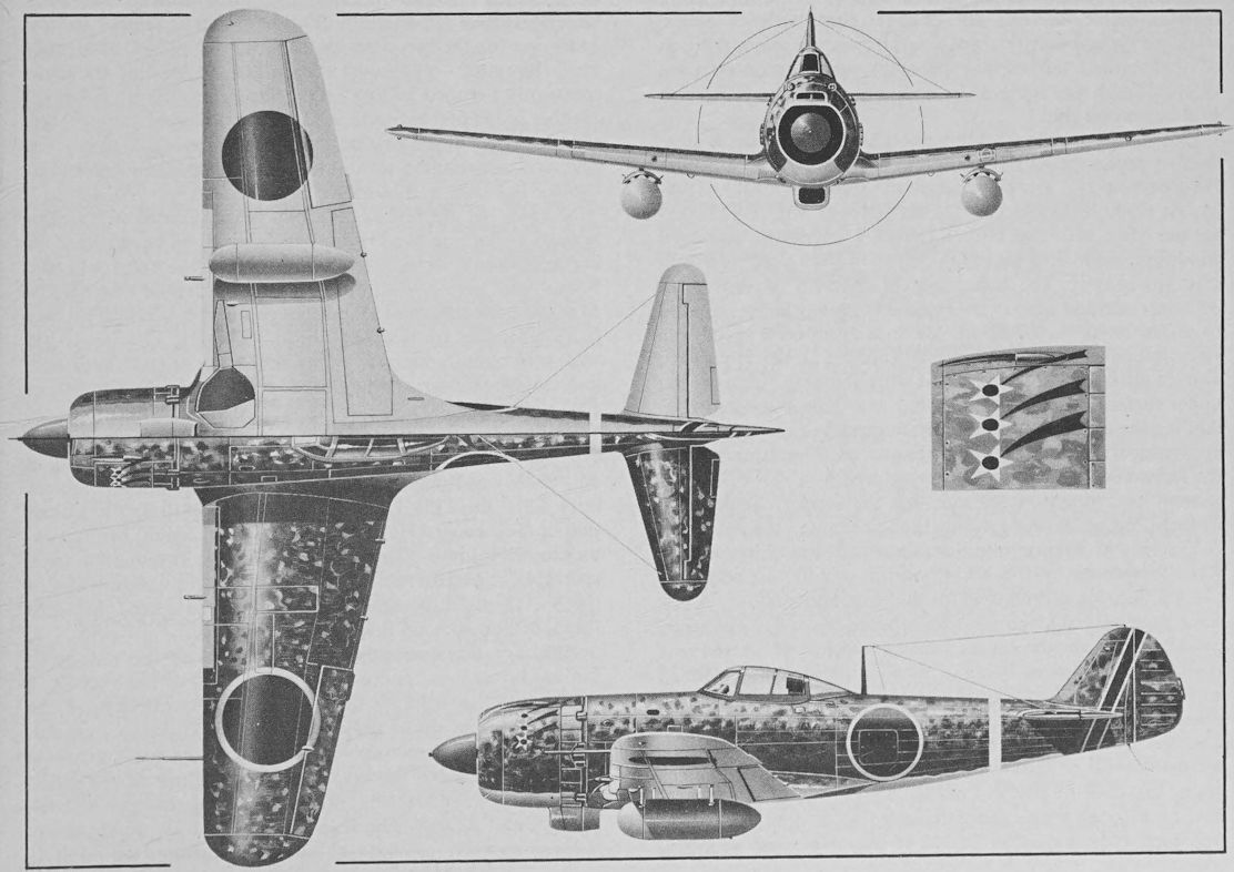 The Ki-84-I-ko Hayate illustrated by the general arrangement drawing was flown by Corporal Noboru Naito of the 520th Provisional Intercept Sentai operating from Nakatsu airfield between December 1944 and March 1945. The upper surfaces of this aircraft were finished in a two-tone green dapple (with substantial areas of flaked paint showing natural metal) and the undersides were pale blue. Standard yellow identification striping appeared on the inboard wing leading edges, the spinner and upper section of the wheel cover were painted in the Chutai colour (ie, red) and the tail stripe was red outlined with white. The three “kill” markings on the engine cowling comprised white star with blue disc and red tail.