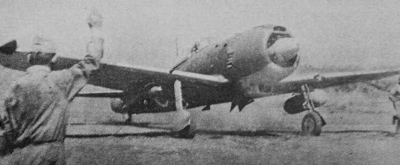 A Hayate of the 52nd Sentai taking-off with a drop tank beneath the port wing and a 551-lb (250-kg) bomb beneath the starboard wing.