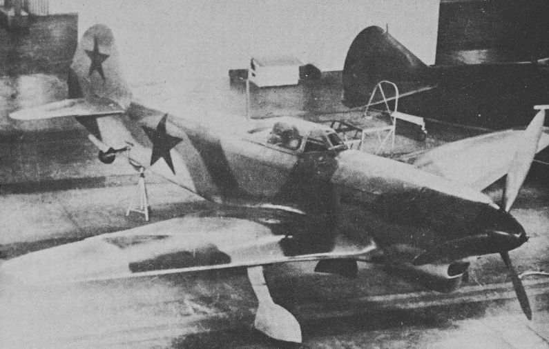 An early production Yak-9 in a Soviet museum. It will be noted that this particular aircraft features the more angular wingtips introduced at a relatively early stage of Yak-9 production. Its upper surfaces are finished in the black-and-green camouflage scheme referred to by Mr Gifford. This finish makes interesting comparison with that of the La-5 in the background which sports dark olive green and dark brown upper surfaces