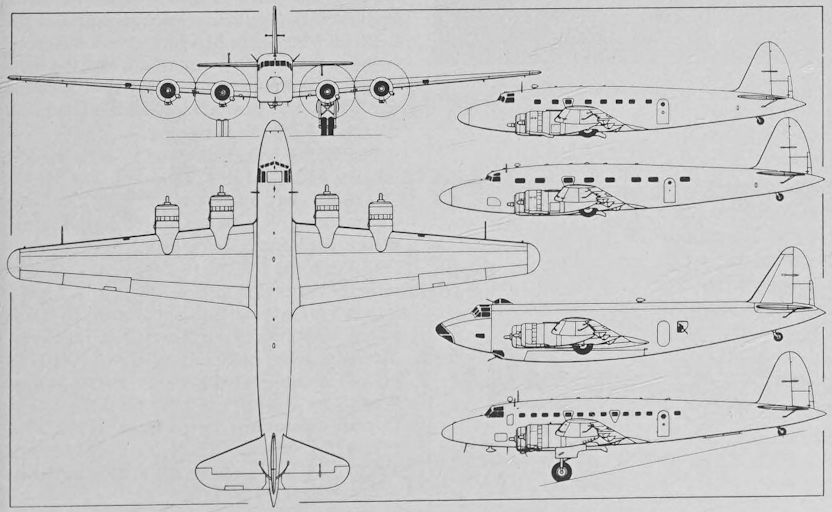 The head-on and plan views illustrate the Pegasus-engined production SM 95, the side-views illustrating (top to bottom) the prototype, the SM 95GA, the SM 95B bomber and the Pegasus-engined production SM 95.