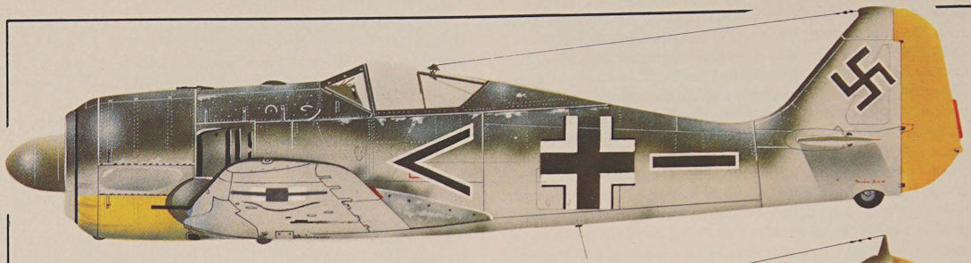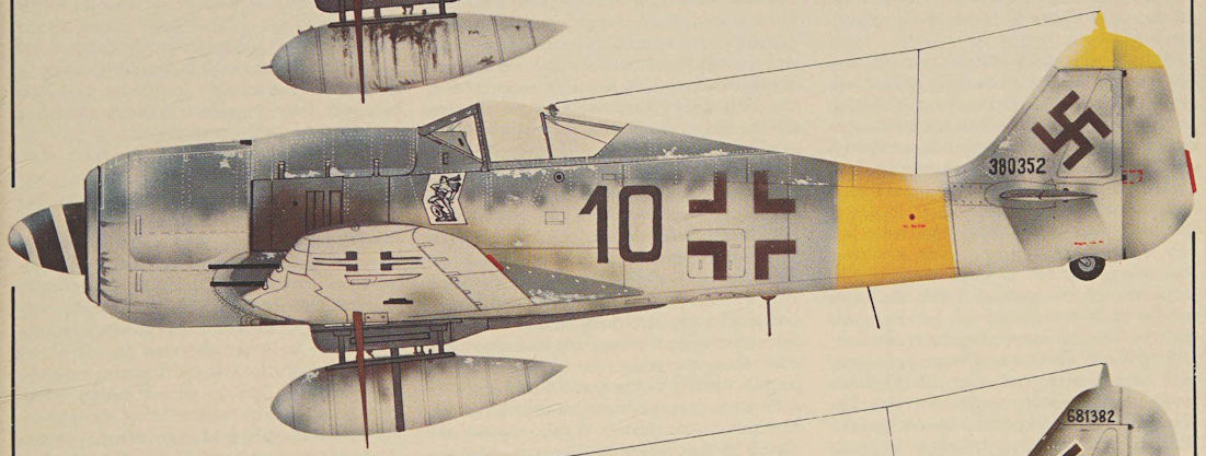 This Fw 190A-2 belonged to the Gruppenstab of I/JG 26 “Schlageter” under Hauptmann Joachim Muncheberg while based at Abbeville-Drucat in the early summer of 1942. The insignia indicate that this aircraft was flown by the Gruppen Adjutant.