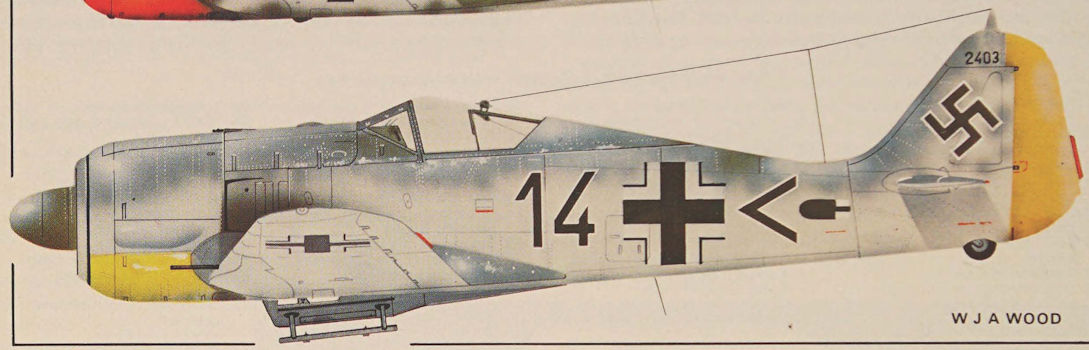 This Fw 190A-4 (Werk-Nr 1167) belonged to the Gruppenstab of III/JG 2 “Richthofen” based at Poix in September 1942. The “Cock’s Head” emblem was introduced by the Kommandeur of III/JG 2, Hauptmann “Assi” Hahn, who led the Gruppe in France from October 1940 until November 1942. It was not uncommon for the “Richthofen” Jagdgeschwader to paint the underside of the engine cowlings of its Fw 190s red.
