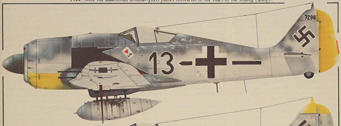 This Fw 190A-8 (Werk-Nr 681382) belonged to the Gruppenstab of 1/JG 26 “Schlageter” and was flown by the Kommandeur, Major Karl Borris, while at Grimberghen, near Brussels, in September 1944. Note the additional armour-glass plates bolted on to the sides of the sliding canopy.