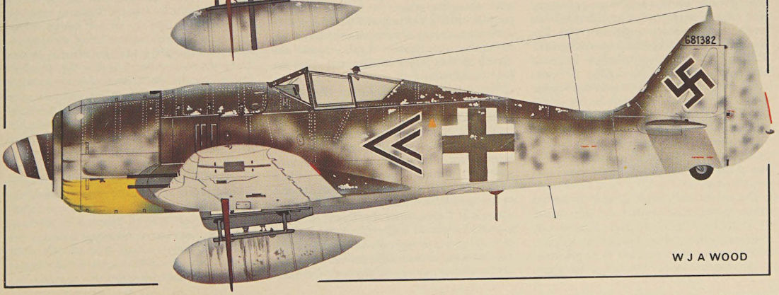 This Fw 190A-4 (Werk-Nr 2403) flown by Feldwebel Karl Niesel of 10.(Jabo)/JG 26 was based at St Omer-Wizernes in the autumn of 1942 and was part of a Schwarm that attacked Hastings on 17 October 1942. While returning to base, Niesel was intercepted by two Typhoons of No 486 (New Zealand) Squadron flown by Pilot Officers C G Thomas and A N Sames who shot down Nr 2403 at 1422 hours, Niesel losing his life.