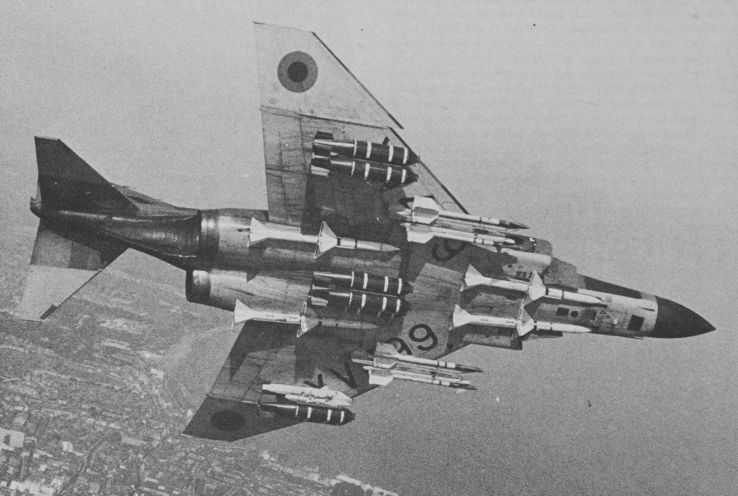 The Hunting BL755 cluster-bomb, adopted by six NATO countries, provides "shot-gun" coverage of ground targets, each 600-lb (272-kg) bomb ejecting over 100 “bomblets”. This McDonnell Douglas Phantom FGR Mk 2 of No 41 Squadron, RAF, is carrying seven BL755s in addition to four Sparrows and four Sidewinders