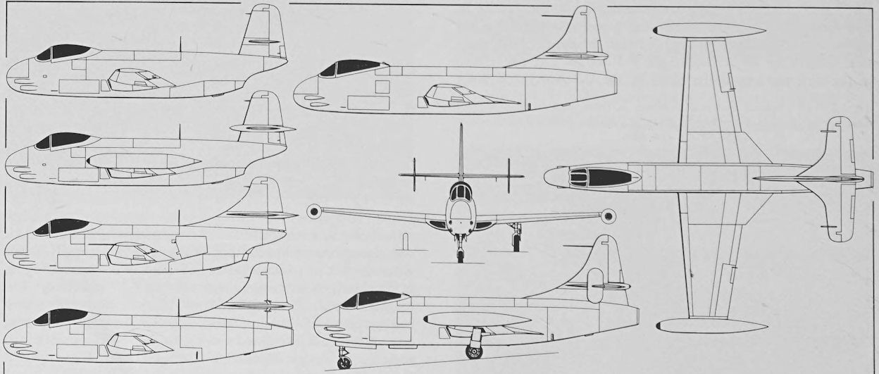 The head-on, plan and lower centre side profile drawings illustrate the production F6U-1 Pirate in its definitive form. The side profile drawings to the left illustrate (top to bottom) the first XF6U-1 in its initial form, the second XF6U-1, the third XF6U-1 and the first XF6U-1 after modification to test the Solar afterburner. The side profile top centre depicts the production F6U-1 Pirate in its initial form.