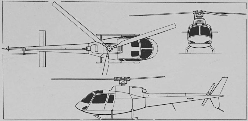 A three-view drawing of the Aerospatiale AS 350 Ecureuil (Squirrel) in its proposed production version.